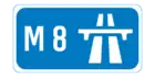 Motorway signage in Ireland is blue, and is similar in design to UK signage. Route numbers use the Motorway typeface, and text uses an Irish variant of the Transport Medium typeface (officially described as italic, but more correctly oblique).