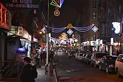 Mott Street (Chinese: 勿街; Jyutping: Mat6gaai1) is a narrow but busy thoroughfare that runs in a north–south direction in the New York City borough of Manhattan. It is regarded as Chinatown's unofficial "Main Street". Mott Street runs from Bleecker Street in the north to Chatham Square in the south. It is a one-way street with southbound-running vehicular traffic only.