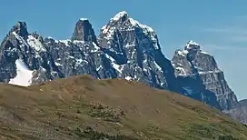 ![]() Mount Geikie centered, flanked by Barbican Peak to right, Bastion Peak and Turret Peak to left | |