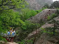 Kuryong Falls ("Nine Dragons Falls") in Kuryongyeon is one of the three major waterfalls in Korea along with Daeseung Falls in Seoraksan.[12] It is 74 meters in height and 4 meters in width.[12] The waterfall cliffs and the bottom are made of one granite mass.[12] Bibbong Waterfall is 139 meters higher, and is named for its refreshing water stream.[13] The rocks there are associated with unique legends.[14]