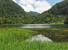 The park includes both Mount Ntringui (1.595 m), the highest peak on Anjouan, and Mount Trindrini (1.474 m), the second-highest, which lies southeast of Mt. Ntringui. These peaks are the source of many of Anjouan's permanent rivers and streams, many of which have carved deep ravines and cirques in the mountain flanks. Lake Dzialandzé is located at 900 meters elevation in a crater on the southeastern flank of Mount Ntringui, and covers an area of 2 hectares. It is home to the little grebe (Tachybaptus ruficollis) and Anjouan's indigenous freshwater fish.[1]