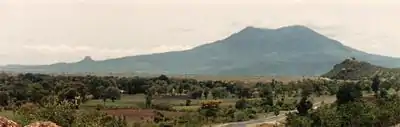 Southwest of Mount Popa is Taung Kalat (pedestal hill), a sheer-sided volcanic plug, which rises 657 metres (2,156 ft) above the sea level. A Buddhist monastery is located at the summit of Taung Kalat. At one time, the Buddhist hermit U Khandi maintained the stairway of 777 steps to the summit of Taung Kalat.[3] The Taung Kalat pedestal hill is sometimes itself called Mount Popa and given that Mount Popa is the name of the actual volcano that caused the creation of the volcanic plug, to avoid confusion, the volcano (with its crater blown open on one side) is generally called Taung Ma-gyi (mother hill). The volcanic crater itself is a mile in diameter.[13]