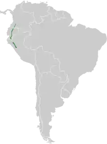 The mountain avocetbill is patchily distributed in Colombia's Central Andes, on the east slope of the Andes in Ecuador, and at a few locations on the east slope in northern Peru. It inhabits the interior, edges, and clearings of elfin forest and humid montane forest and is often seen in roadside shrubbery. In elevation it ranges between 2,600 and 3,600 m (8,500 and 11,800 ft) in Colombia, mostly between 2,400 and 3,200 m (7,900 and 10,500 ft) but as low as 1,700 m (5,600 ft) in Ecuador, and between 2,700 and 3,200 m (8,900 and 10,500 ft) in Peru.[5]