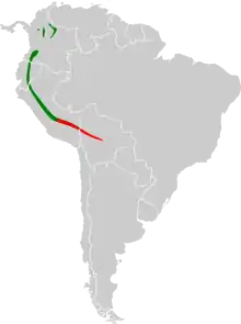 | Distribution map of Mountain Cacique. Green: C. c. leucoramphus and C. c. peruvianus; red: C. c. chrysonotus. | |