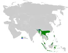 It is found in Bangladesh, Bhutan, Cambodia, China, India, Indonesia, Laos, Malaysia, Myanmar, the Philippines, Thailand, and Vietnam. Its natural habitats are subtropical or tropical moist lowland forest and subtropical or tropical moist montane forest.