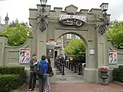 In May 1994, Warner Bros. purchased the location, and began construction on "Warner Bros. Movie World Germany". The park had a grand opening on 29 June 1996 with 20,000 invited guests including Johannes Rau, Ernst Löchelt, August Everding, Gustava Everding, Michael Douglas, Sophia Loren, Ron Williams, Amanda Lear, David Copperfield, Claudia Schiffer, Chris O'Donnell, Hans Meiser and Heinz Hoenig as special guests.[2][3][4][5][6] The park opened to the general public on 30 June 1996.[1] Zeitgeist Design and Production's Ryan Harmon served as the Director of Show Development for Warner Bros. International Recreation Enterprises, where he conceived, wrote and managed the design team for Warner Bros. Movie World in Germany's worth of rides, shows and attractions.[7] Botticelli's - Atelier der angewandten Malerei and Sanderson Group were responsible for designing and painting the theming for the park.[8][9] Alan Griffith Architect and Alder Constructions were also involved in the park's development.[10][11]