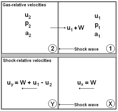 Next, suppose a reference frame is then fixed to the shock so it appears stationary as the gas in regions 1 and 2 move with a velocity relative to it. Redefining region 1 as x and region 2 as y leads to the following shock-relative velocities: