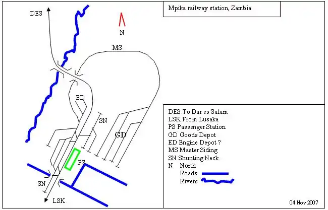 At the centre of Mpika railway station is a crossing loop and several parallel sidings mainly used for shunting. The passenger station with a grand entrance is located at this point with a prominent road opposite.