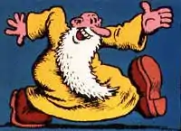 Crumb's bearded guru is too unapologetic to be called a con man. Despite his renunciation of the material world, he is an unrepentant sybarite. His straight talk, while refreshing, can get him into trouble, as when he was kicked out of heaven for telling God it's "a little corny" in "Mr. Natural Meets God".[5] But he may be the only Crumb creation who is genuinely likable.[6] Mr. Natural's advice is seemingly at odds with his image as a sage, and his inventions are at once brilliant and crackpot.[7] Perhaps Mr. Natural's most famous aphorism is, "Mr. Natural sez, Use the right tool for the job" — spoken on seeing Flakey Foont unloading a truck full of bowling balls with a pitchfork. Asked, "What does it all mean?", he responds, "Don't mean sheeit..."[8]