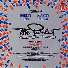 After four previews, the Broadway production, directed by Joshua Logan and choreographed by Peter Gennaro, opened on October 20, 1962 at the St. James Theatre, where it ran for 265 performances. The cast included Robert Ryan, Nanette Fabray, Jack Haskell, Anita Gillette and Baayork Lee. The musical premiered in a Broadway season dominated by hits like Oliver!, A Funny Thing Happened on the Way to the Forum and Stop the World – I Want to Get Off. Mr. President received unenthusiastic reviews. Although Berlin's score was praised, the show "was just too old-fashioned and out of date."[1] Berlin continued to work, revising Annie Get Your Gun and writing songs, such as for the film project Say It With Music (which was never produced), but "Broadway would never again see a truly Berlin work on the stage". Mr. President was the final Lindsay and Crouse collaboration.[3]