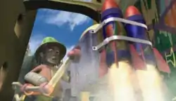 One touching episode is Heavenly Bird,[10] where Stain discovers a bird in a cage and wants to eat it. After a riotous chase through the alley while he tries to capture the animal, Stain realizes that the bird is sad and dying. It just wants to see its tropical homeland. Stain works through the night to build a cardboard model of the bird's homeland and when the Heavenly Bird sees it, he thinks he's home and dies. Another episode, titled Toy Robot, is about a remote controlled toy that decides that it no longer wants to be a servant, but wants to fly like the birds it sees. Stain, being helpful, comes up with different ways of making the robot fly, with comically tragic results. The last episode is an epilogue to the series and is for half an hour. The story revolves around Stain who sees a woman living in a high rise apartment and immediately falls in love with her. After a few comic attempts to get to her, all of which fail, he accidentally switches places with the attractive Handsome Stain from his mirror. This Stain has no problems getting to the woman and seducing her.[11]