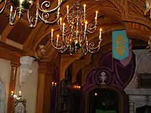 As with the 1955 incarnations of the Snow White and Peter Pan dark rides, the exterior facade of Mr. Toad's Wild Ride was fashioned to resemble a colorful medieval tournament tent, and its loading queue was located within a large opening in the front wall of the show building. Guests boarded their vehicles directly adjacent to a huge, elaborately painted mural spanning the entire front wall of the space housing the interior scenes; this mural depicted both the cast of the film on which the ride was based as well as the scenarios encountered within the attraction.