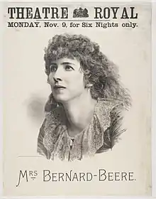 Beere married three times; firstly in 1874 to Edward Cholmeley Dering (1833–1874), with whom she had a daughter, Janet Elizabeth Adela Dering (1874–1875). In 1876 as a young widow she married merchant Edward Beer (1850–1915) at St. George's church in Bloomsbury in London.[5] After her second marriage she retired a short time from the stage, presently returning to it as Mrs. Bernard Beere. They presumably divorced before in 1900 as a 'widow' she married wine merchant Alfred Charles Seymour Olivier (1867–1922) in St. Mary's church in Kilburn.[6][7][8] In 1892 she toured Australia with Otho Stuart as her leading man and in the same year visited the United States professionally.