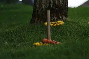 Muckers, also known as ring toss (not to be confused with the ring toss carnival game) or circle horseshoes, is an outdoor game, commonly played at summer camps, in which players take turns throwing circular rings at a stick, standing about one foot high. It is a spin-off of Quoits[1][2] and the popular horseshoes.