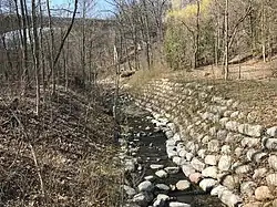 The creek enters into the Don River valley at the Don Valley Brick Works, where its flow bifurcates through or adjacent to the ponds, and then re-converges shortly before exiting into the Don River south of Bayview Avenue.[11] The ponds serves to hold and provide biological filtration for the inflow from Mud Creek prior to discharge into the Don River, and is part of Toronto storm-water management strategy.[15] Due to the geology and depth of the ravine, erosion and foresting work has been ongoing to preserve its integrity as well as the Beltline Trail that runs through it.[16]