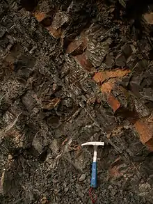 Mudrocks form in various colors, including: red, purple, brown, yellow, green and grey, and even black. Shades of grey are most common in mudrocks, and darker colors of black come from organic carbons. Green mudrocks form in reducing conditions, where organic matter decomposes along with ferric iron. They can also be found in marine environments, where pelagic, or free-floating species, settle out of the water and decompose in the mudrock.[8] Red mudrocks form when iron within the mudrock becomes oxidized, and depending on the intensity of red, one can determine if the rock has fully oxidized.[2]
