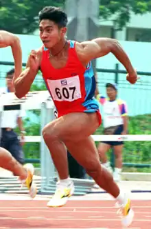 Muhamad Hosni Muhamad (born 15 February 1972) is a Singaporean track coach and former track and field sprinter who specialised in the 100 metres. He represented Singapore in athletics at the 1993 Southeast Asian Games,[2] the 1994 Asian Games[3] and the 1994 Commonwealth Games,[4][5] where he was the flag bearer for the Singapore contingent.[6] Hosni retired from competitive running in 1997.[1]