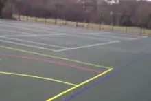 A Multi Use Games Area (abbreviated MUGA) is usually a steel anti vandal outdoor fenced area with built in goal post units for various types of sports games, such as football, basketball or tennis.[1] The outer fencing makes it easier to keep the ball in play. MUGAs are often installed at schools. MUGAs can be supplied in Half court (Open one end with one combination goal unit), Full court (Fully enclosed with two end goal units) and Key area (Open single goal end with key line markings).