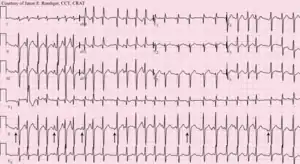 Multifocal (or multiform) atrial tachycardia (MAT) is an abnormal heart rhythm,[2] specifically a type of supraventricular tachycardia, that is particularly common in older people and is associated with exacerbations of chronic obstructive pulmonary disease (COPD). Normally, the heart rate is controlled by a cluster of cells called the sinoatrial node (SA node). When a number of different clusters of cells outside the SA node take over control of the heart rate, and the rate exceeds 100 beats per minute, this is called multifocal atrial tachycardia (if the heart rate is ≤100, this is technically not a tachycardia and it is then termed multifocal atrial rhythm).[3]