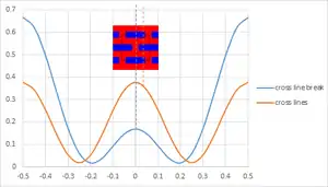 A two-beam interference pattern (half-pitch <0.5 λ/NA) forms a set of regularly spaced lines. Breaks in such lines, e.g., brick patterns, are deviations from the interference pattern. Such breaks generally do not dominate the pattern, and are thus small deviations. These deviations are insufficient to completely offset the constructive or destructive interference of the underlying regular line pattern; sidelobes often result.[36][37] Line end gaps are easily bridged under dipole illumination.[38] Another mask exposure (usually referred as a cut mask) is therefore necessary to break the line pattern more robustly.