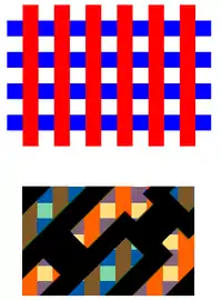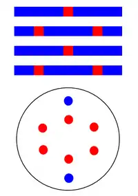 The earliest implementation of multiple patterning involved line cutting. This first occurred for Intel's 45nm node, for 160 nm gate pitch.[39] The use of a second mask to cut lines defined by a first mask does not help increase feature density directly. Instead it allows definition of features, e.g., brick patterns, which are based on lines spaced at a minimum pitch, in particular, when the lines are near the resolution limit and are generated by the two-beam interference mentioned above. The two-beam interference still dominates the diffraction pattern.[36] In fact, in the absence of a separate cut exposure, the gap between the ends of the minimum pitch lines will be prohibitively large.[40][41] This is due to rounding resulting from reduced spatial frequencies.[42]