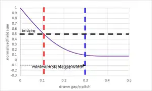 The rounding of line tips naturally leads to a tradeoff between shrinking the line width (i.e., the width of the line tip) and shrinking the gap between opposite facing tips. As the line width shrinks, the tip radius shrinks. When the line tip is already less than the point spread function (k1~0.6-0.7), the line tip naturally pulls back,[19] increasing the gap between opposite facing tips. The point spread function likewise limits the resolvable distance between the centers of the line tips (modeled as circles). This leads in turn to a tradeoff between reducing cell width and reducing cell height. The tradeoff is avoided by adding a cut/trim mask (see discussion below).[20] Hence, for the EUV-targeted 7nm node, with an 18 nm metal linewidth (k1=0.44 for λ=13.5 nm, NA=0.33), the line tip gap of less than 25 nm (k1=0.61) entails EUV single patterning is not sufficient; a second cut exposure is necessary.