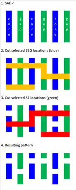 Self-aligned blocking or cutting is currently being targeted for use with SAQP for sub-30 nm pitches.[79] The lines to be cut are divided into two materials, which can be etched selectively. One cut mask only cuts every other line made of one material, while the other cut mask cuts the remaining lines made of the other material. This technique has the advantage of patterning double pitch features over lines at the minimum pitch, without edge placement errors.[35] Cut-friendly layouts are processed with the same minimum number of masks (3), regardless of using DUV or EUV wavelength.[80]
