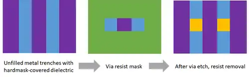 Self-aligned contact and via patterning is an established method for patterning multiple contacts or vias from a single lithographic feature. It makes use of the intersection of an enlarged feature resist mask and underlying trenches which are surrounded by a pre-patterned hardmask layer. This technique is used in DRAM cells[50] and is also used for advanced logic to avoid multiple exposures of pitch-splitting contacts and vias.[51][52][53]