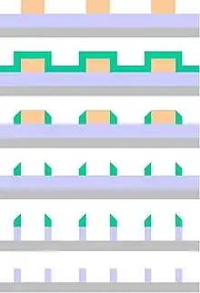 The main issues with the spacer approach are whether the spacers can stay in place after the material to which they are attached is removed, whether the spacer profile is acceptable, and whether the underlying material is attacked by the etch removing the material attached to the spacer. Pattern transfer is complicated by the situation where removal of the material adjacent to the spacers also removes a little of the underlying material. This results in higher topography on one side of the spacer than the other.[47] Any misalignment of masks or excursion in pre-patterned feature critical dimension (CD) will cause the pitch between features to alternate, a phenomenon known as pitch walking.[48]