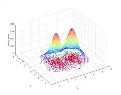 We consider estimating the density of the Gaussian mixture (4π)−1 exp(−1⁄2 (x12 + x22)) + (4π)−1 exp(−1⁄2 ((x1 - 3.5)2 + x22)), from 500 randomly generated points. We employ the Matlab routine for 2-dimensional data. The routine is an automatic bandwidth selection method specifically designed for a second order Gaussian kernel.[13] The figure shows the joint density estimate that results from using the automatically selected bandwidth.