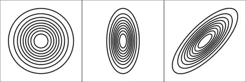 The choice of the kernel function K is not crucial to the accuracy of kernel density estimators, so we use the standard multivariate normal kernel throughout: , where H plays the role of the covariance matrix. On the other hand, the choice of the bandwidth matrix H is the single most important factor affecting its accuracy since it controls the amount and orientation of smoothing induced.[5]: 36–39 That the bandwidth matrix also induces an orientation is a basic difference between multivariate kernel density estimation from its univariate analogue since orientation is not defined for 1D kernels. This leads to the choice of the parametrisation of this bandwidth matrix. The three main parametrisation classes (in increasing order of complexity) are S, the class of positive scalars times the identity matrix; D, diagonal matrices with positive entries on the main diagonal; and F, symmetric positive definite matrices. The S class kernels have the same amount of smoothing applied in all coordinate directions, D kernels allow different amounts of smoothing in each of the coordinates, and F kernels allow arbitrary amounts and orientation of the smoothing. Historically S and D kernels are the most widespread due to computational reasons, but research indicates that important gains in accuracy can be obtained using the more general F class kernels.[6][7]