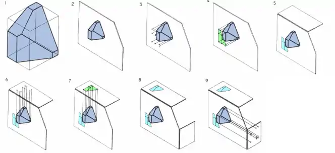 • Fig.8: The third plane of projection is added, perpendicular to the previous two.
