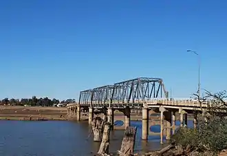 The Mulwala Bridge is a road bridge over Lake Mulwala, formed by a weir on the Murray River, on the state border between New South Wales and Victoria in Australia. The bridge links the border towns of Yarrawonga in Victoria and Mulwala in New South Wales. The bridge was built in 1924 and designed by Percy Allan using a Pratt truss.[1]