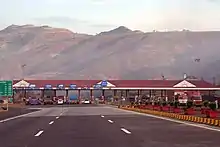 Toll is collected at Khalapur (Pali Phata) (for the Mumbai-Pune direction) and at Talegaon (for the Pune-Mumbai direction). The toll ranges from ₹270 (US$3.50) for private cars, to ₹1,750 (US$23) for multi-axle trailer trucks.[12] The toll collection data is kept as secret as per the RTI inquiry raised by activist Vivek Velankar. The expressway contract with the Ideal Road Builders (IRB) has been uploaded but the toll collection details are not there.[13][14] There is no plan to give toll waiver for this expressway.[15]