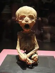The human bodies appear to have been disinterred between 1870 and 1958. During that time, a local tax was in place requiring a fee to be paid for "perpetual" burial. Some bodies for which the tax was not paid were disinterred, and some—apparently those in the best condition—were stored in a nearby building. The climate of Guanajuato provides an environment which can lead to a type of natural mummification, although scientific studies later revealed that some bodies had been at least partially embalmed.[1] By the 1900s the mummies began attracting tourists. Cemetery workers began charging people a few pesos to enter the building where bones and mummies were stored.