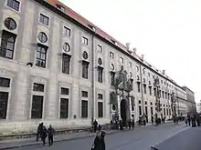 Facing the church, the Marstall, the building for the former Court Riding School (Hofreitschule) was erected under King Maximilian Joseph by Klenze between 1817 and 1822. The construction of the monumental portal arch, surmounted by busts of Castor and Pollux, is considered one of the most mature early works of Klenze. The extensive buildings for the royal stables do not longer exist. From 1923 the Marstall housed the Marstallmuseum which was in 1941 moved into Nymphenburg Palace. Today the building serves as scenery house, workshop building and study stage of the Residenz Theatre.