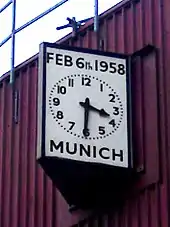 Also unveiled that day was a memorial to the members of the press who died at Munich, which consisted of a bronze plaque that named the eight lost journalists. It was unveiled by Munich survivor Frank Taylor on behalf of the Football Writers' Association. The original plaque was stolen in the 1980s and replaced by a replica now behind the counter in the press entrance.[75] The final memorial was the Munich clock, a simple two-faced clock paid for by the Ground Committee and attached to the southeast corner of the stadium, with the date "6 Feb 1958" at the top of both faces and "Munich" at the bottom. The clock has remained in the same position since it was first installed.[75] The clock was unveiled on 25 February 1960 by Dan Marsden, the chairman of the Ground Committee.[76]
