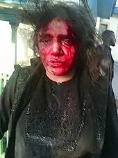 The mob dragged Farkhunda into the street and beat and stomped her.[7] She was bludgeoned with sticks and rocks outside the mosque, then placed into the road and run over with a car, dragging her body almost 100 m. Police offered no resistance, and directed traffic around the scene.[12] The mob then dragged her body to the nearby bank of the Kabul River, took turns stoning her and set her on fire. Her body was soaked in blood and would not burn, so the crowd ripped off articles of their own clothing to ignite and maintain the fire. The mob shouted the Takbir during the lynching.[10][13]