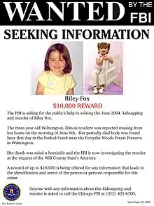 Riley Fox (March 31, 2001 – June 6, 2004) was a 3-year-old girl from Wilmington, Illinois, who was murdered on June 6, 2004.[1] After Riley's father was initially accused and then cleared by DNA evidence, paroled convict Scott Eby confessed to the crime and was convicted.