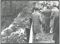 On January 22, 1957, following a rapid thaw of recent snowfall,[26] a construction worker named Leonard Prescott spotted what he later described as being "these flesh-colored things"[27] behind a guard rail as he drove along a rural country road named German Church Road, approximately 200 feet east of County Line Road in unincorporated Willow Springs. Initially unsure of the origin of what he had seen, and believing the forms may be mannequins, Prescott later returned to the site with his wife Marie, who fainted upon taking a closer look at what her husband had earlier seen.[14] The forms were actually the nude, frozen bodies of the Grimes sisters, and the Prescotts immediately reported their findings to the Willow Springs Police Department.[6][n 6][n 7]