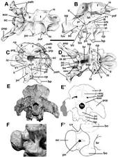 Furthermore, a unique combination of traits is present that are in themselves not unique. In the braincase, the processus basipterygoidei are situated at the front underside of the basisphenoid while the entrance of the deep depression of the recessus basisphenoideus is directed obliquely upwards and to the rear. The basisphenoid shows a shallow wide notch between the tubera basilaria and the processus basipterygoidei. The chevron bones are rather straight.[1]