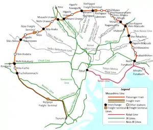 The Musashino Line (武蔵野線, Musashino-sen) is a railway line operated by the East Japan Railway Company (JR East). It links Tsurumi Station in Yokohama with Nishi-Funabashi Station in Chiba Prefecture, forming a 100.6 km unclosed loop around central Tokyo. Passenger operations are limited to the 71.8 km portion between Fuchūhommachi and Nishi-Funabashi; the Tsurumi to Fuchūhommachi portion, called the "Musashino South Line", is normally used only by freight trains. The line forms part of what JR East refers to as the "Tokyo Mega Loop"(Japanese: 東京メガループ) around Tokyo, consisting of the Keiyō Line, Musashino Line, Nambu Line, and Yokohama Line.[2]
