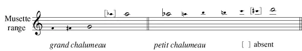 The petit chalumeau, as already mentioned, was added by Martin Hotteterre; though physically connected to the grand chalumeau, and sharing the same wind-supply from the bellows, it has its own double reed and functions as a separate instrument. The lowest note on the petit chalumeau is an A flat a semi-tone below the higher A on the grand chalumeau, and keeping the two chalumeaux in tune and in balance is one of the difficulties of the instrument.
