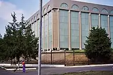 Three Soviet architects Abdulov, Nikiforov and Rosenblum designed the new building of museum in the form of a huge cube, with all sides separated into even metal squares, lined with aluminum sheets on the outside. The lower part of the building and the entrance are decorated with polished gray marble. The upper part is glazed with chrom-brugnatellite, smoothing the sunlight and setting indoor matte illumination.[5]