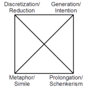 Many techniques are used to analyze music. Metaphor and figurative description may be a part of analysis, and a metaphor used to describe pieces, "reifies their features and relations in a particularly pungent and insightful way: it makes sense of them in ways not formerly possible."[7] Even absolute music may be viewed as a "metaphor for the universe" or nature as "perfect form".[8]