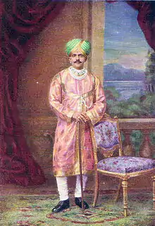King Chamaraja Wodeyar IX was also a patron of the fine arts and literature, having been tutored by his own court musicians Veena Sheshanna and Veena Subbanna.[19] The king was well versed in the violin and often participated, along with other musicians, in violin performances at the Krishna temple located in the palace premises. He is known to have helped many budding artists, both by patronage of their talent and in their personal difficulties. He sponsored Mysore Vasudevacharya (who later became a famous musician) to train at Tiruvayyar under the famous Patnam Subramanya Iyer. He also formed the "Amateur Drama Club" to encourage young artists. However, he died at the early age of 32 while travelling in Kolkata.[19] Veena Shamanna was the son of Rama Bhagavatar, an immigrant from Tanjore who came to Mysore during a famine, seeking royal patronage. His birth name was Venkata Subramanya.[20] In 1876, Veena Shamanna was appointed court musician for his talent in both vocal and instrumental classical music. He was known as "Tala Brahma" for his mastery of the veena, violin, ghata and swarabhat.[21] A conservative artist, he played by the norms of theorical classical music and was a tutor to the royal family. In honour of his achievements, a street in Mysore city was named after him. His compositions were published by his son Veena Subramanya Iyer in a book called Sangeeta samayasara in 1915.[22]