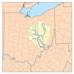 The Muskingum River (Shawnee: Wakatamothiipi)[4] is a tributary of the Ohio River, approximately 111 miles (179 km) long, in southeastern Ohio in the United States. An important commercial route in the 19th century, it flows generally southward through the eastern hill country of Ohio. Via the Ohio, it is part of the Mississippi River watershed. The river is navigable for much of its length through a series of locks and dams.