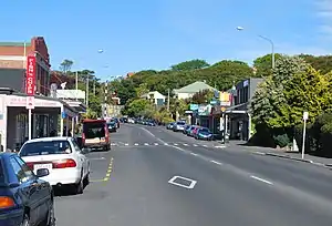 The northern side of the Musselburgh Rise is skirted by another main thoroughfare, Portobello Road. This road joins with the southern end of Portsmouth Drive close to the northeastern point of the rise, and continues across the causeway at Andersons Bay Inlet, though the junction is a limited one, and traffic may not turn right from the Musselburgh part of Portsmouth Drive to continue across the causeway. Close to the junction is a large memorial stone to the Taranaki Māori prisoners of the New Zealand Wars who were transported south to Dunedin, many of whom constructed the causeway and much of Dunedin's foreshore roads as forced labour.[5] A branch railway ran along Portobello Road in this area from the 1870s until 1912, and rail links continued to the suburb until the track were lifted in 1928.[6]