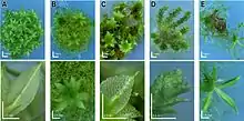 Wild-type Physcomitrella and knockout mosses: Deviating phenotypes induced in gene-disruption library transformants. Physcomitrella wild-type and transformed plants were grown on minimal Knop medium to induce differentiation and development of gametophores. For each plant, an overview (upper row, scale bar corresponds to 1 mm) and a close-up (bottom row, scale bar equals 0.5 mm) is shown. A, Haploid wild-type moss plant completely covered with leafy gametophores and close-up of wild-type leaf. B-D, Different Mutants.[1]