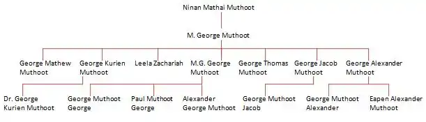The Muthoot family is one of the foremost business houses in South India. The family has interests in various sectors of business varying from financial services to media. The founder of the Muthoot Group was Muthoot Ninan Mathai, from whom the business house was later taken over by his son, M. George Muthoot. The family traces its roots to Thevervelil Family in the small town of Kozhencherry in Central Travancore.[1]